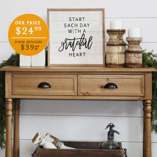 But what resonates most with us is the message... "Start each day with a grateful heart." I mean does it get any more beautiful than that?! The perfect message for your family to remind yourselves of how wonderful life is! Not only the perfect piece for you and your family but also a wonderful housewarming present or gift to congratulate those newlyweds you know! :)