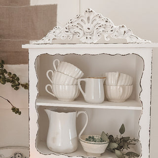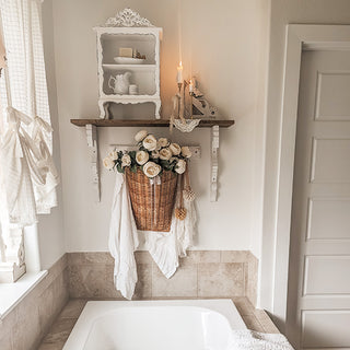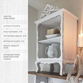 - Elevate your farmhouse interior decor with the timeless beauty of our Cottage core Ornate Distressed Wood Shelf.