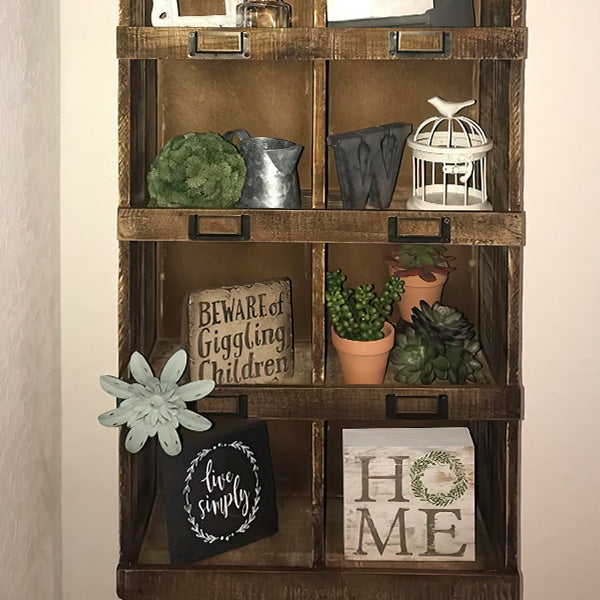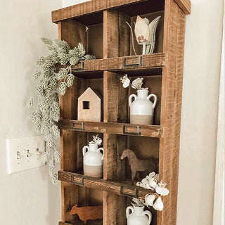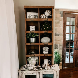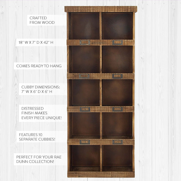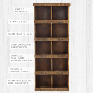 Whether you place it in your office, craft room, garage, kitchen, shed, or mudroom, this shelf will not disappoint. Made from beautifully distressed wood and standing at 42" tall, it features ten versatile storage cubbies perfect for organizing anything from tools and spices to office supplies and craft materials. Its rustic charm will seamlessly enhance your farmhouse decor.