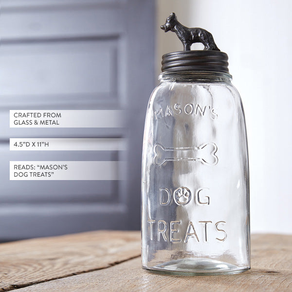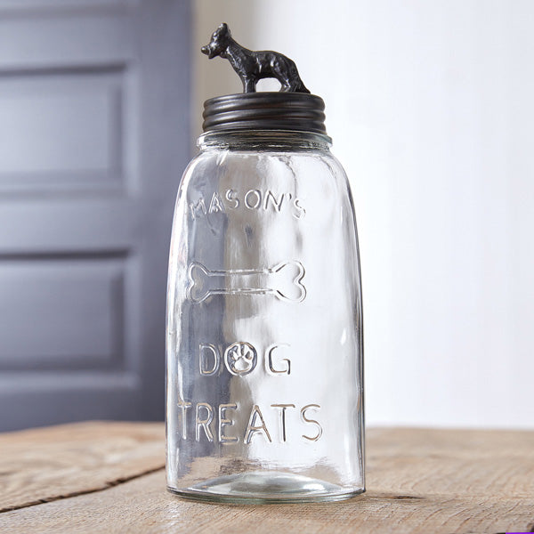 Embossed Glass Design: Features “MASON’S DOG TREATS” and a bone design etched into the clear glass for a timeless, rustic look.