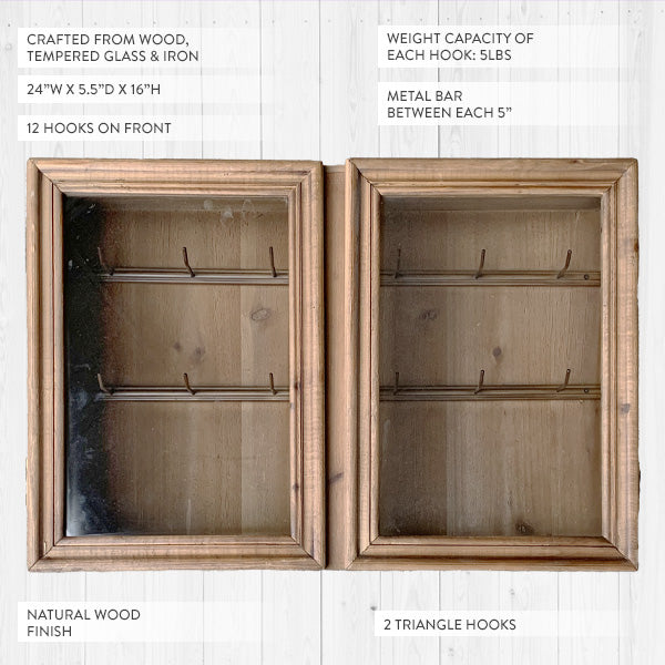 - Glass Doors for Style and Visibility: Double glass doors open to reveal 12 sturdy hooks, combining practicality with an elegant look.