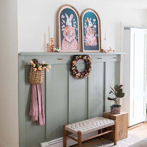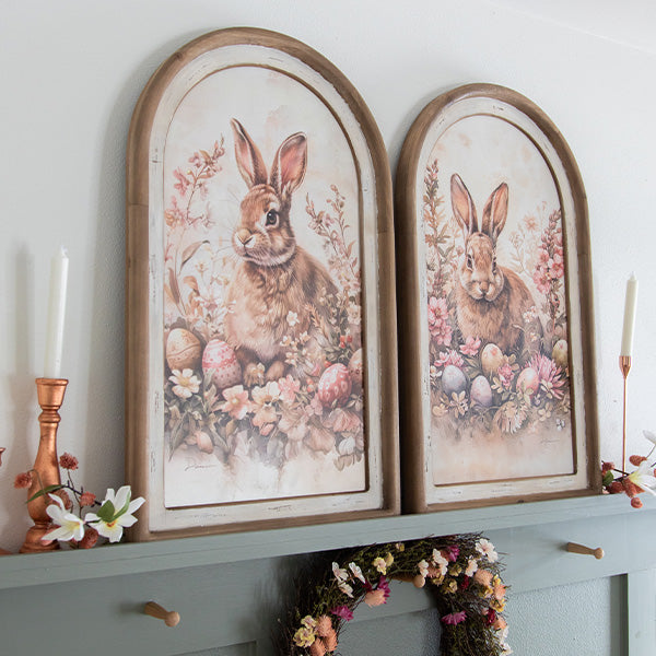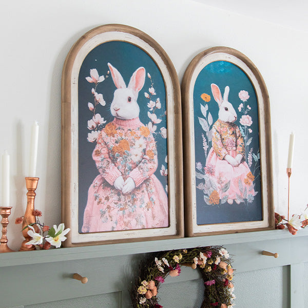 DOUBLE-SIDED BUNNY PRINTS ONLY (14.5"W x 26.5"H) Two stunning reversible prints that slide right into our arch frames. Flip to the front and you'll find sweet cottontail rabbits nestled among wildflowers with delicate Easter eggs—all those soft pinks and vintage botanical vibes. Turn them around for sophisticated Victorian-style bunnies in pink floral gowns against a rich teal backdrop. Four looks. Two prints. Zero commitment.