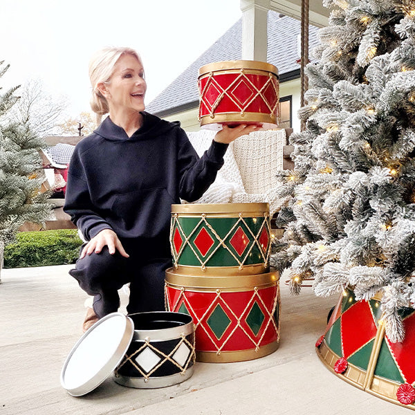 But they're not just pretty. Each drum opens up for storage—gift wrap, ribbons, ornaments, holiday cards. Display them all season, and boom, your storage is handled without anyone knowing. When January hits, they nest together for compact storage. 🎁