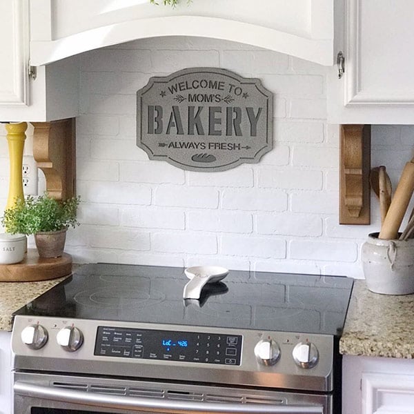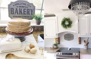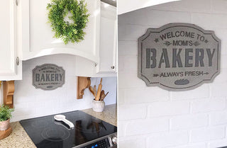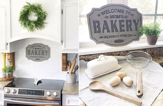 Mmmm...there’s nothing like the smell of warm freshly baked bread straight out of the oven or the inviting aromas of newly glazed ooey gooey cinnamon rolls. It’s that enticing whiff of traditional goods from the town bakery that creates a warm feeling in our hearts and finds a special spot in our memories. Not to mention a yummy spot in our bellies LOL! That is why we simply can’t get enough of this farmhouse style Mom's Bakery Engraved Sign!