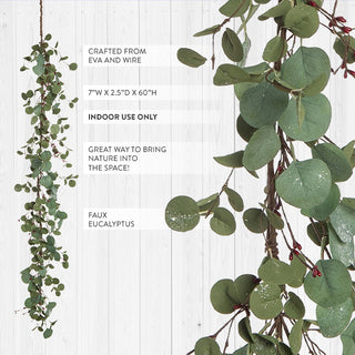 Crafted with meticulous attention to detail, each leaf of this faux eucalyptus garland is intricately designed to replicate the natural texture and color variation of real eucalyptus foliage. Measuring 60 inches in length, it's perfect for draping across mantels, staircases, or weaving through shelves to create a picturesque display.