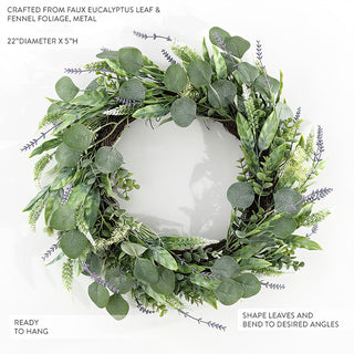 Elevate your farmhouse-inspired home decor with the natural elegance of our 22-Inch Eucalyptus and Fennel Faux Wreath. This versatile accent piece effortlessly complements rustic, country, and farmhouse styles, adding a touch of organic charm to any space. Whether adorning your front door, mantel, or interior walls, this handcrafted wreath brings timeless beauty and tranquility to your farmhouse sanctuary.