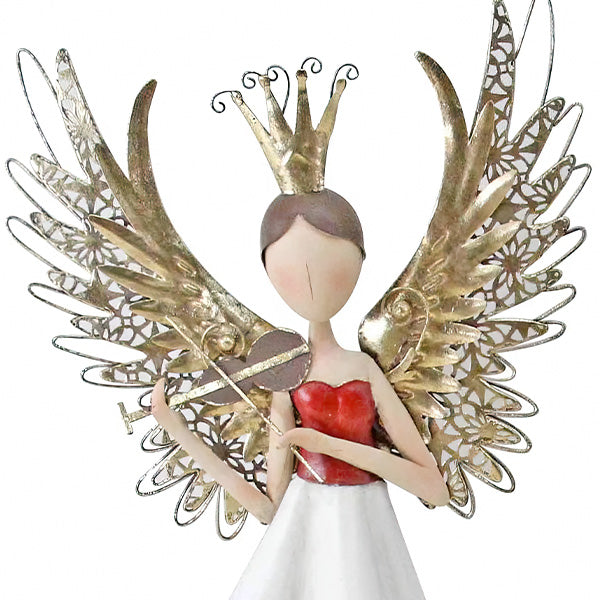 Her red, white, and gold distressed finish tells a story all its own. No two angels are exactly alike—each one bears her own weathered charm, brushed with gold highlights and gentle wear that feels earned, not manufactured. The heart she holds close glows deep red with meaning, and that tiny crown with its scrollwork detailing adds just the right touch of celestial whimsy.