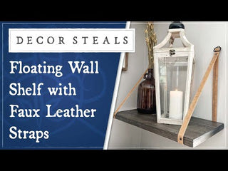 Our Floating Wall Shelf with Faux Leather Straps combines the look of clean lines with a distressed finish for a minimalist modern look with a touch of rustic appeal. The simple yet unique design of these wooden shelves with faux leather straps will fill your home with character while creating a great place for storage and display.