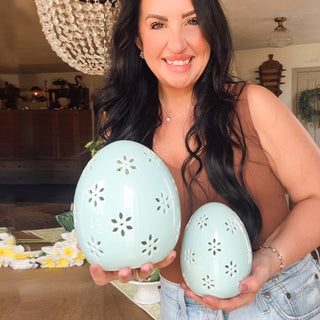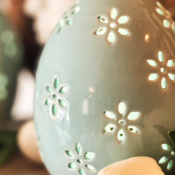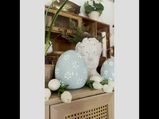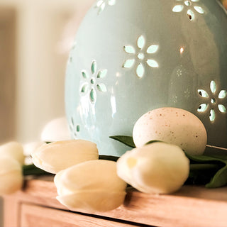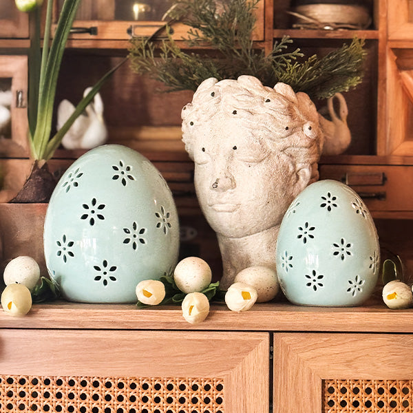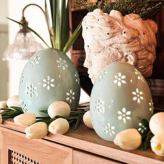 Illuminate your Easter decor with the soft glow of these Floral Cutout Light-Up Easter Eggs, Set of Two! Crafted from glossy ceramic in a serene pale blue, these decorative eggs feature intricate floral cutouts that let light shine through, creating a warm and inviting ambiance. Their smooth, polished finish beautifully reflects surrounding light, adding a touch of elegance to your spring display.
