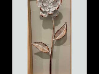 Each piece features a floral design encased in a rectangular wooden frame, combining rustic appeal with artistic flair. The stylized flowers, crafted from metal, bring a striking three-dimensional effect, adding depth and texture to your decor. Their muted, distressed tones—such as soft white and pale blue—contrast beautifully against neutral walls, making them a versatile addition to any room.