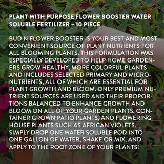 Bud N Flower Booster is your best and most convenient source of plant nutrients for all blooming plants. This formulation was especially developed to help home gardeners grow healthy, more colorful plants and includes selected primary and micronutrients, all of which are essential for plant growth and bloom. Only premium nutrient sources are used and their proportions balanced to enhance growth and bloom on all of your garden plants, container grown patio plants, and flowering house plants such as African Violets. Simply drop one water soluble pod into one gallon of water, shake or mix, and apply to the root zone of your plants!