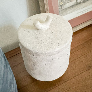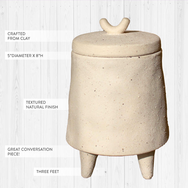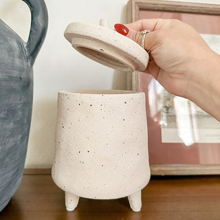 Beautifully crafted from clay, this Footed Ceramic Cylinder Canister combines the past with the present into a timeless design that you will love to have displayed in your home for years to come! Style this on top of a set of your favorite books on your table or shelf. Add this on your entryway table to hide your keys or spare change. Display this on your coffee table to hide your remote controls. Stick this in your bathroom to store your Q-tips, cotton balls, or favorite jewelry.