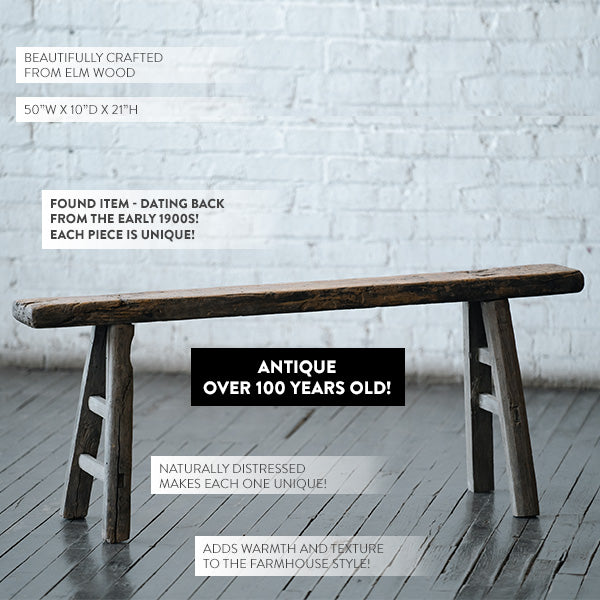 Check out this ANTIQUE bench from the early 1900s! This one-of-a-kind bench comes with all the natural rustic beauty of distressed elm wood that has aged to perfection for over a 100 years!