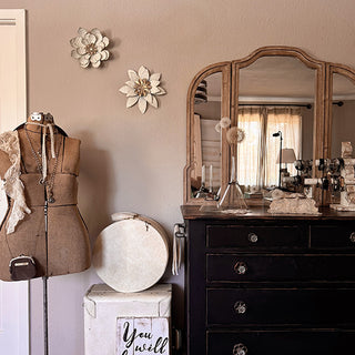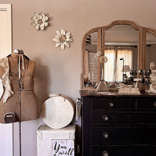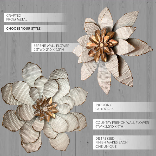 Bring timeless charm and graceful elegance to your home with our French Country Bloom Wall Flowers. Inspired by the delicate beauty of vintage garden florals, these dimensional wall accents are crafted from textured metal and finished in soft ivory tones with a perfectly weathered patina. Whether you select the fuller, rounded petal style or the more pointed layered bloom, each piece delivers a warm and romantic touch to any space—from a cozy entryway to a farmhouse-style bedroom.
