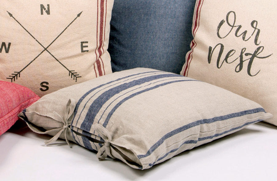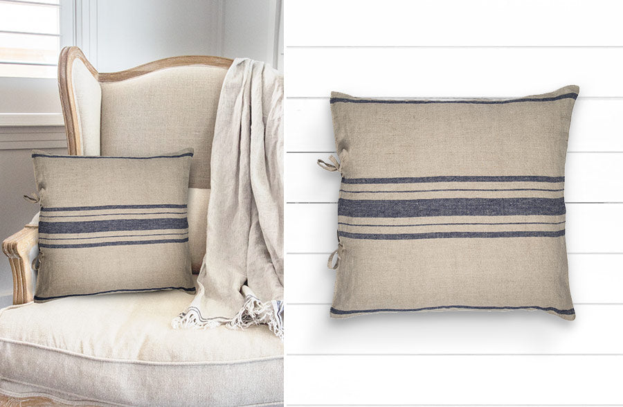 Complete your summertime home decor with this timeless French navy striped pillow. This pillow is a must have staple for all homes! It is so versatile. It is the perfect addition to any room- formal or casual. There is just something so fresh and inviting about this piece! Detailed with delicate ties, this pillow can be added to a porch, a bed set, living room seating, foyer bench and more! Picture the lovely possibilities it holds! This is just the most perfect pillow made from the most beautiful looking fabric! Even better, it’s priced to make the PERFECT gift for friends and loved ones! But don’t forget to snag one for you!!
