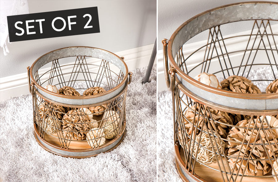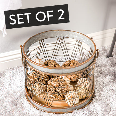 This GORGEOUS set of TWO barrel planters is the best of both worlds! With its tin and gold material and zig zag design, this piece has industrial charm. The AMAZING earthy wood base brings in SO much farmhouse personality too!! This set of barrel planters will WOW everyone styled on your front porch, outdoor patio, or your indoor botanical space. Style these beauties with your favorite potted flowers or plants. We can see these even styled faux flowers or plants. Place these barrel planters in your living room filled with your cozy blankets, books or magazines! Add these to your bathroom to store your toilet paper and rolled guest towels. The possibilities are truly ENDLESS with this set of two!