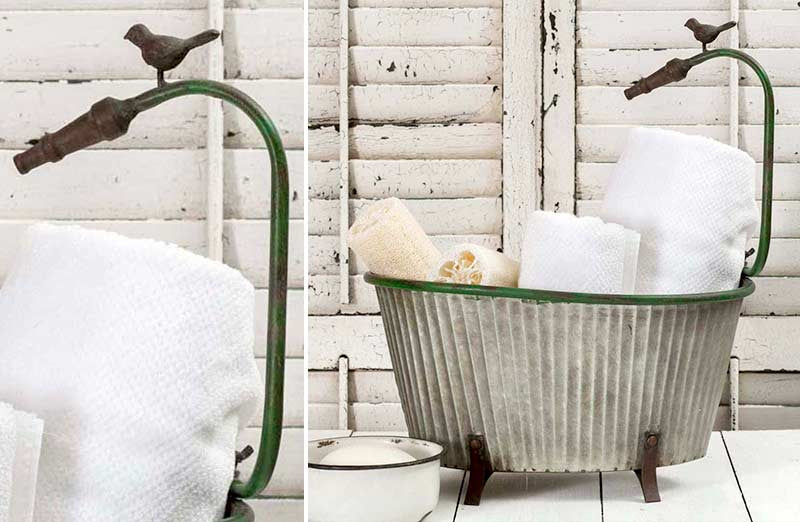 This rustic farmhouse cutie is the PERFECT bubble bath to store your beautiful bath towels toiletries tissues or anything you can think of! We love love love how different this is! The antique metal bathtub is S.T.U.N.N.I.N.G!