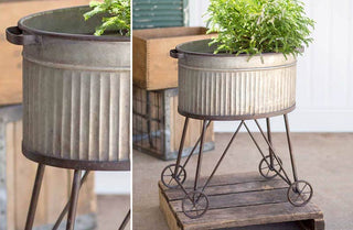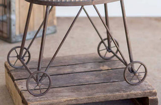 The uniqueness of this metal mobile planter creates a perfect accent to any outdoor space mud or even common room in your house! Your imagination can run wild with this piece. It can fit anything your heart desires you don't need to stick solely to greenery. We could see this filled with magazines towels or even accent pillows. The detail on this is impressive and not lost on this piece. Not only is this planter unique the worn metal adds an antique element to its character.