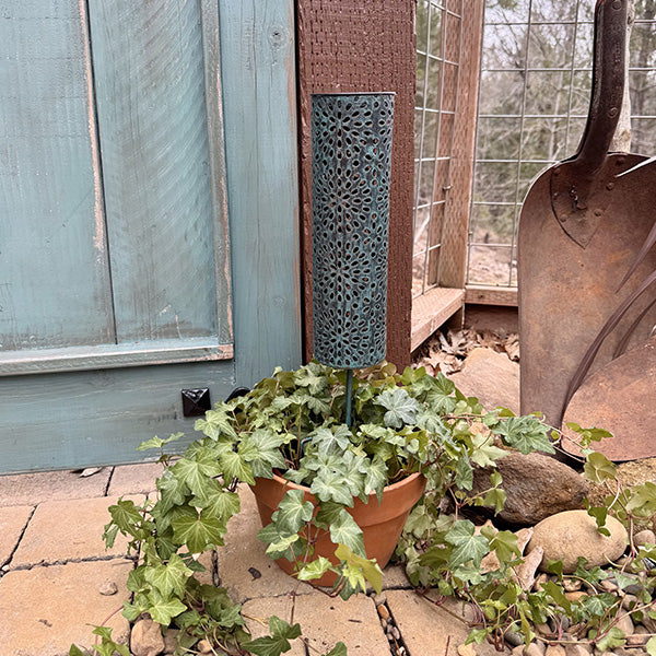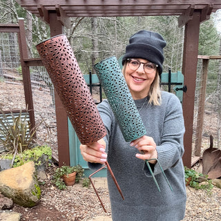 Give your garden a glow-up with our Cylindrical Metal Outdoor Solar Light Yard Stakes, Set of Two! These dazzling lights don’t just brighten up your yard—they put on a shadow show with their intricate floral-inspired cutouts. As the sun sets, watch them cast mesmerizing patterns that turn your outdoor space into a magical retreat. One shines in a rich copper hue, while the other flaunts a patinated blueish green finish—a perfect pair for that farmhouse vibe. No cords, no hassle, just pure solar-powered charm lighting up your nights!
