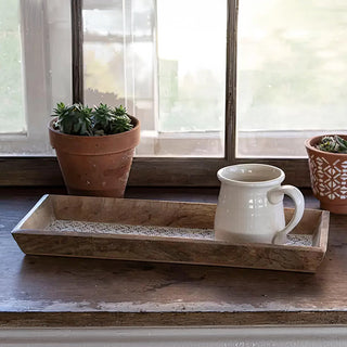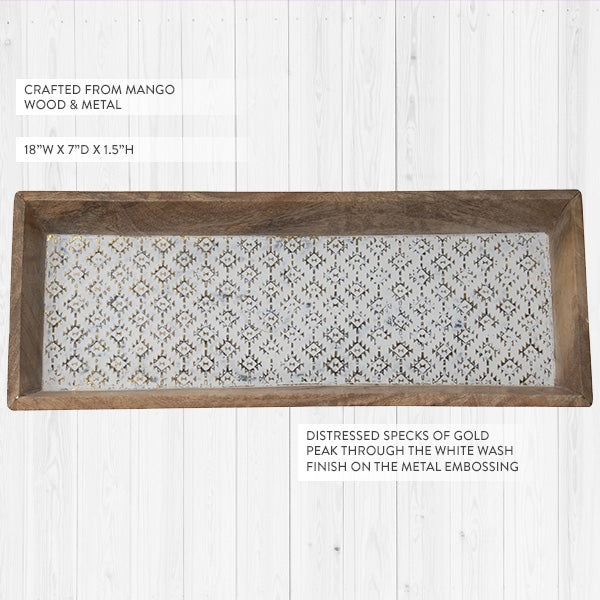 Crafted with a beautifully weathered wood frame, this tray features a stunning embossed metal base with an intricate geometric diamond design. And here’s the detail that has us swooning: distressed specks of gold peek through the soft whitewash finish, catching the light and adding a warm, luxe glow. It’s the kind of accent that turns practical into truly special.