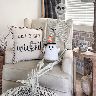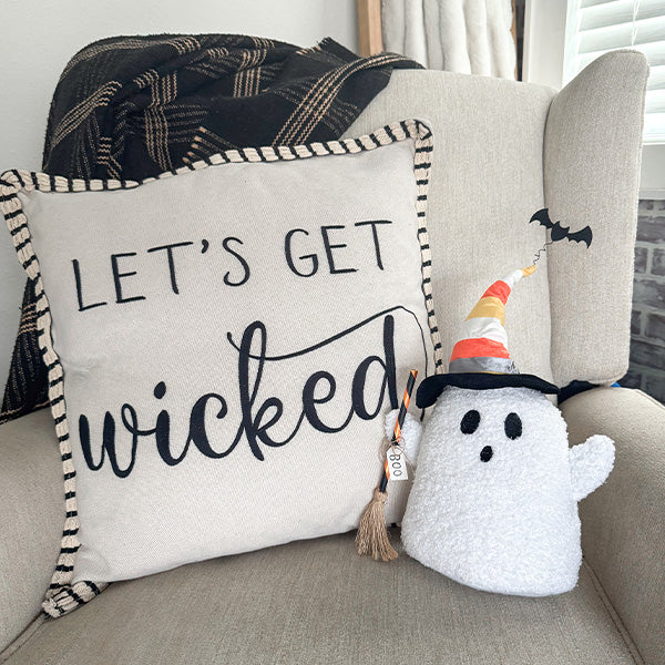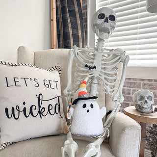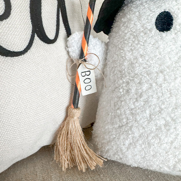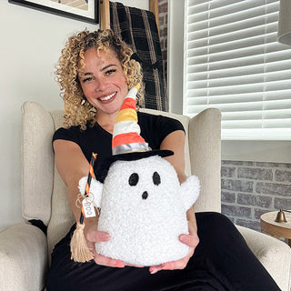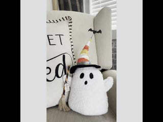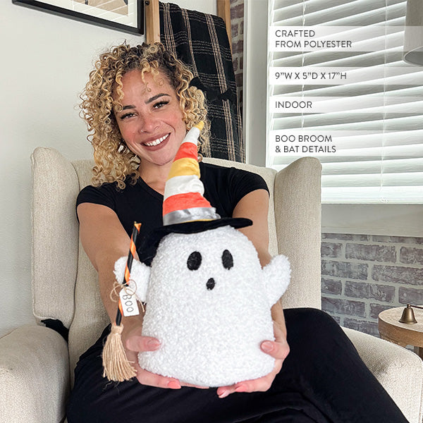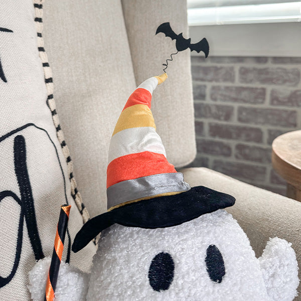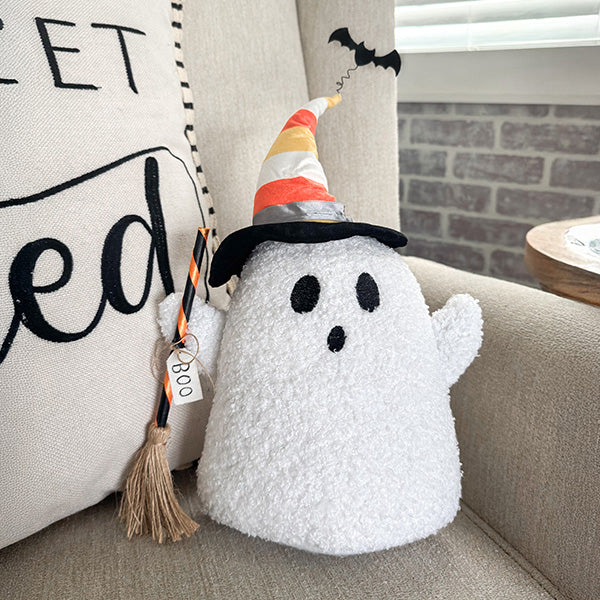 Add a sweet yet spooky twist to your Halloween with our Candy Corn Witch Ghost Pillow! This charming ghost is all dressed up for the season in a tall candy corn-striped witch hat, complete with a felt bat perched on top. Tucked under one arm is a mini broomstick with a tiny “Boo” tag, ready to sweep in a bit of festive fun.