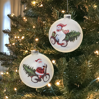 Bring playful holiday cheer to your decor with this set of two Glass Christmas Bike Riding Ornaments, featuring Santa and a snowman joyfully pedaling in festive style. These whimsical, hand-painted glass ornaments add a fun, nostalgic touch to your tree or holiday displays.