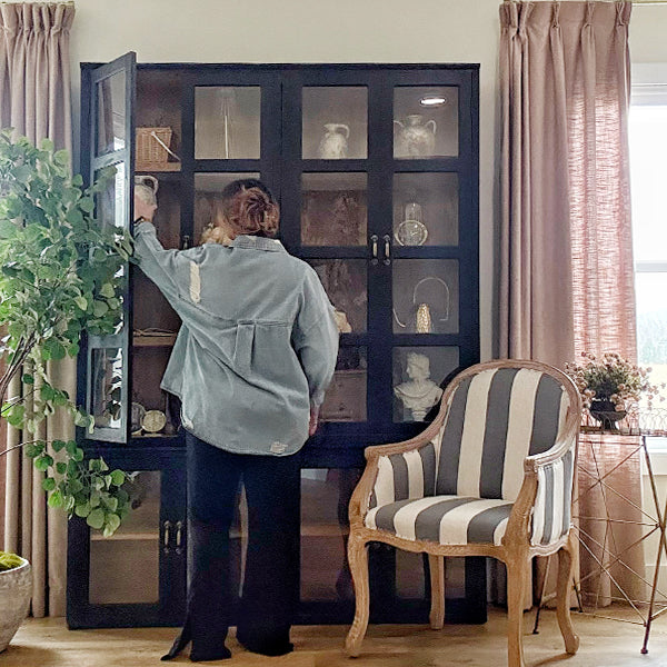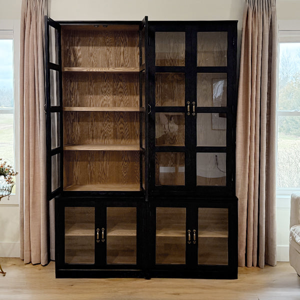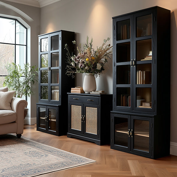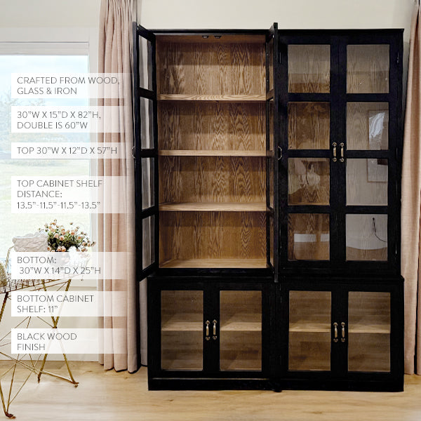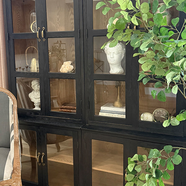 • Ample Display & Storage Space: Multiple shelving sections behind eight glass doors offer both upper and lower display zones for organization and flair.