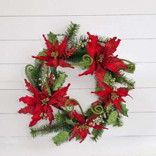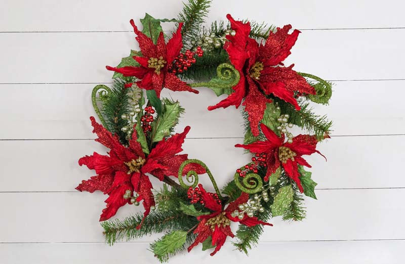 -Beautifully crafted from faux pine with green berries and red velvet glittered poinsettia