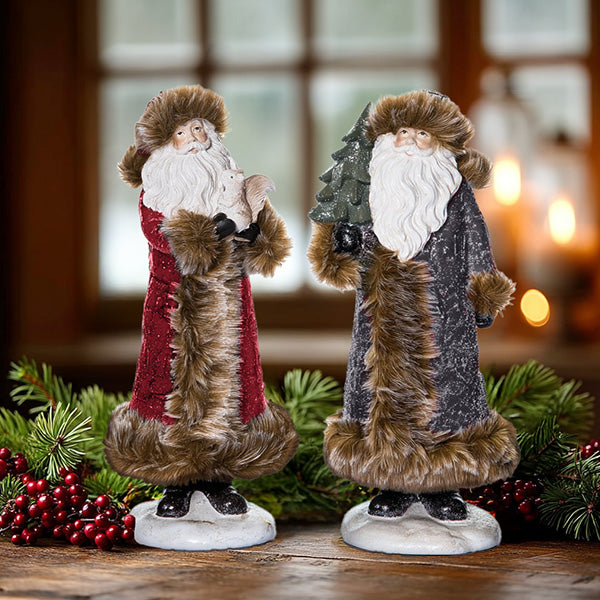 That's exactly what this German-inspired Santa set delivers—except you're getting both in one perfectly curated pairing. One in classic deep red holding a sweet woodland creature, the other in shimmering silver carrying a miniature frosted tree. Together, they create that "I've been thoughtfully collecting these" vibe without the years of hunting.