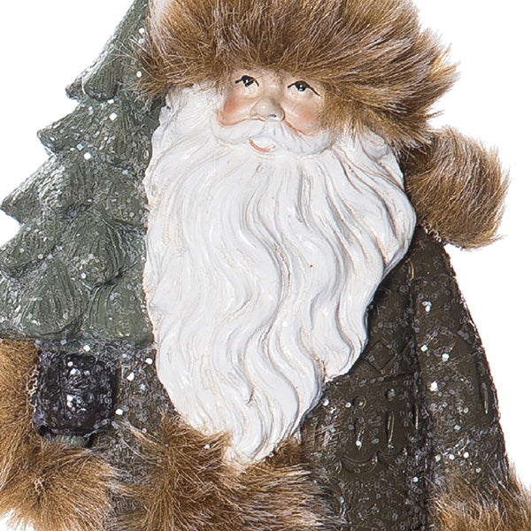 - Each Santa features luxurious faux fur trim and glitter accents