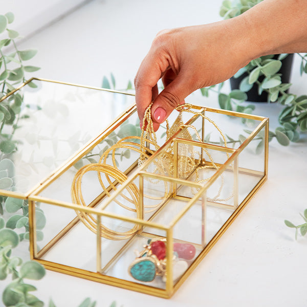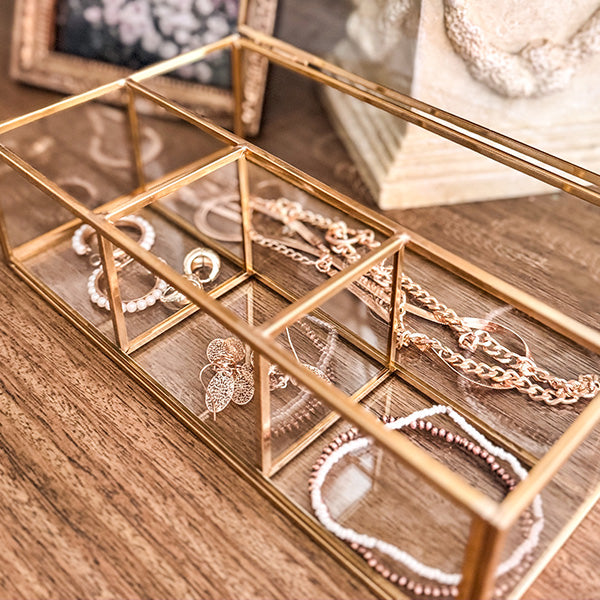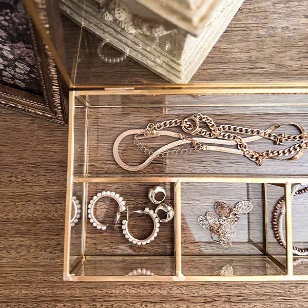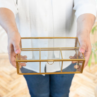 This Golden Vintage Glass Box is the perfect way to organize and display your favorite trinkets, jewelry, or even tea bags in a sophisticated, timeless way. The gold edges and glass compartments create a luxurious look, making this piece a stunning addition to any vanity or dresser.