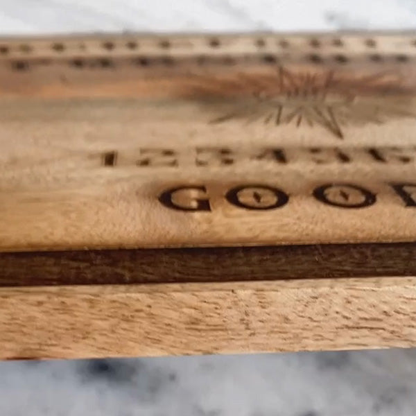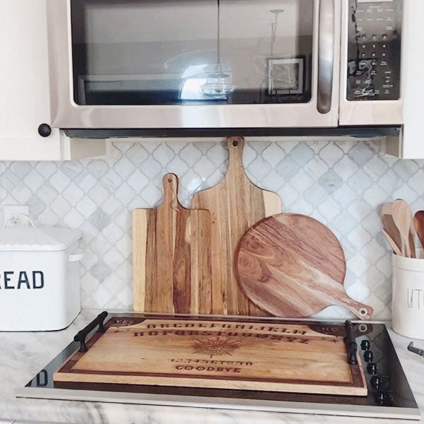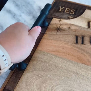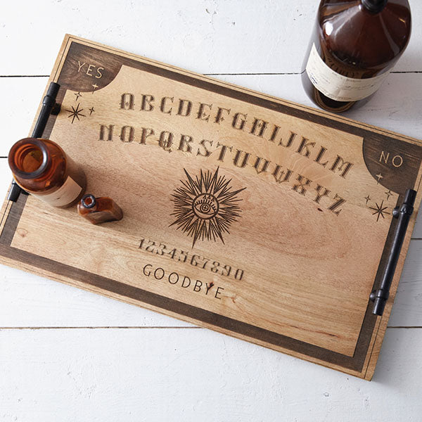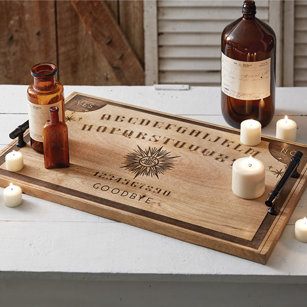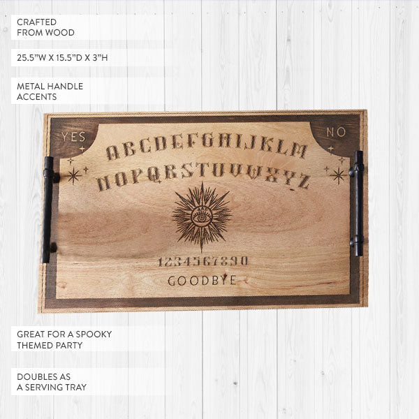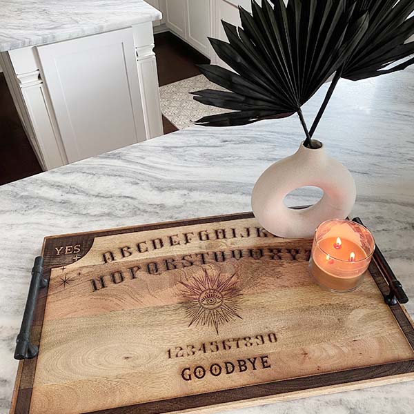 This Halloween Ouija Board Inspired Wooden Server will be THE talk of your guests... The super cool design will create a spooky vibe while also being an eye-catching statement! This will be the perfect decor piece for the halloween season, year after year! Be sure to bring it out for the trick-or-treaters too! We can see a large bowl of candy being the perfect added touch to this tray!