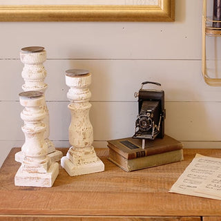 Our Handmade Wooden Candle Sticks, Set of 3 are sure to bring a farmhouse country style to your home with their white wash finish and delicate chippy detailing that we all love.
