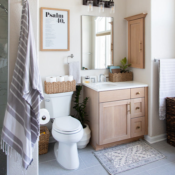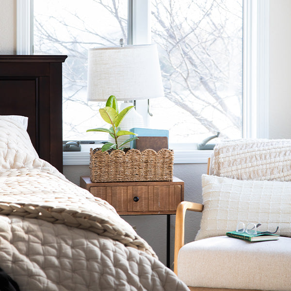 Tuck one on your toilet tank for rolled towels or TP that actually looks pretty. Stack books and remotes on the coffee table. Corral skincare on your nightstand. The rectangular shape fits where round baskets can't, and the two sizes nest together when you're not using them both.