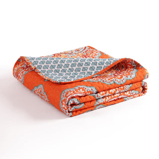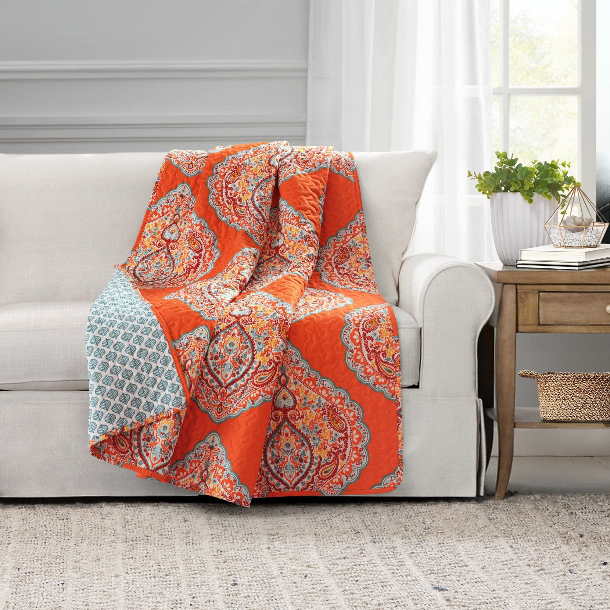 The bright orange color on the front of the Harley Throw really pop while the light blue accents tone it down. The reverse side of the throw features a repeating leaf printed in blue against a white background on the back side. This gives you two great looks in one affordable piece.