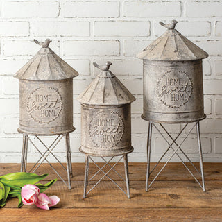 We just love the details of these silo containers, from the birds perched on the top to the font of the message!