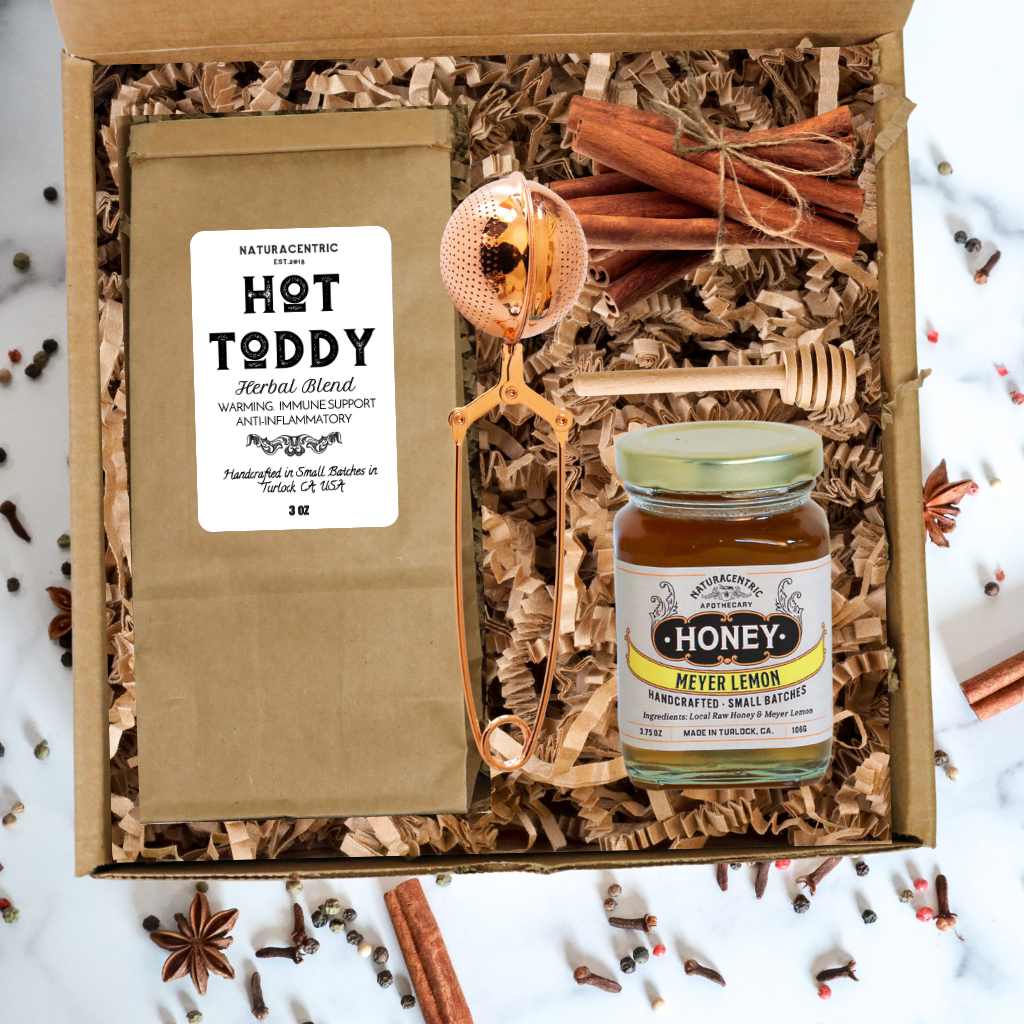 What's Included: Hot toddy bag, Small Lemon infused Honey, Rose Gold Steeper, bundle of cinnamon sticks for garnish, small wooden honey dipper, recipe card all snug in a compact box.