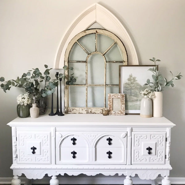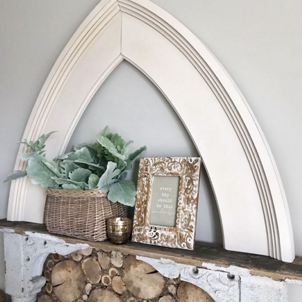 We have really done it this time! It's stunning! Perfect for any vintage lover or farmhouse fanatic! Can you say LOVE at first sight?! We definitely did with this HUGE Crown Molding Wooden Arch Decor!