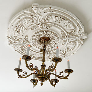 Our exquisite HUGE Distressed Baroque Ceiling Medallion, designed in the distinguished Baroque style, boasts the most opulent and elegant features: flowers, scrolls, and acanthus leaves. At its core lies a grand, intricately crafted rosette with a floral design, serving as the centerpiece of this magnificent composition.