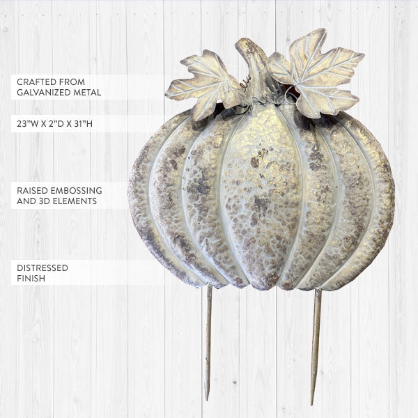 Crafted from durable galvanized metal, it adds a rustic and industrial touch to your autumn landscape. Perfect for welcoming guests to your home, this oversized pumpkin stake stands firmly in your yard, garden, or even a large planter. Its charming design and finish make it a delightful addition to your outdoor space all season long.