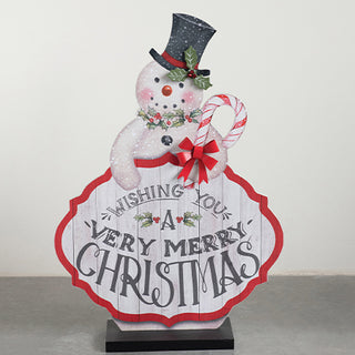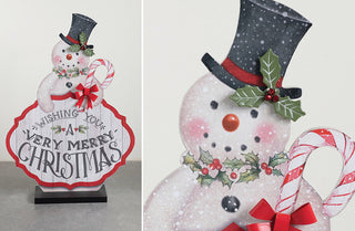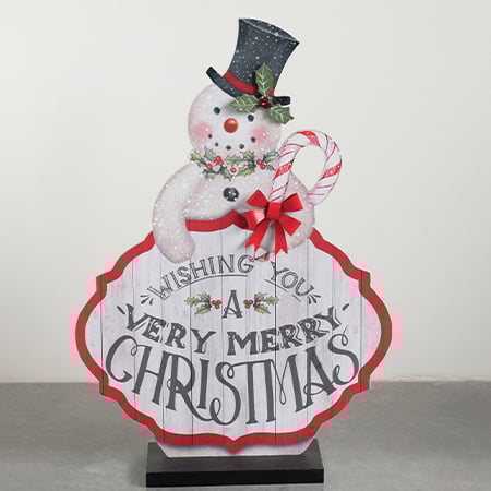 Standing at 31" tall with a sweet smile and eyes full of wonder this Snowman had us at hello! The designer paid a lot of attention to all the details and we can tell! Did you see the little bow and the little holly?!