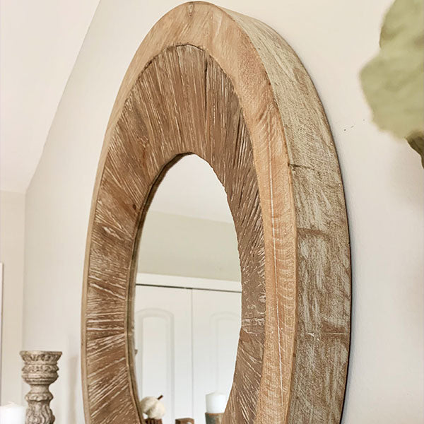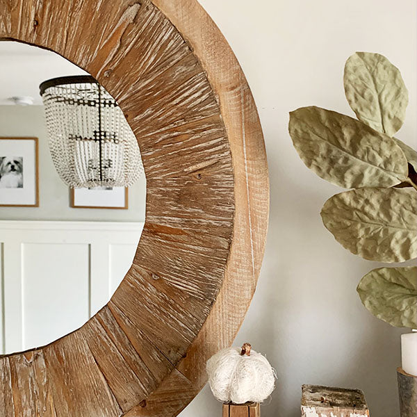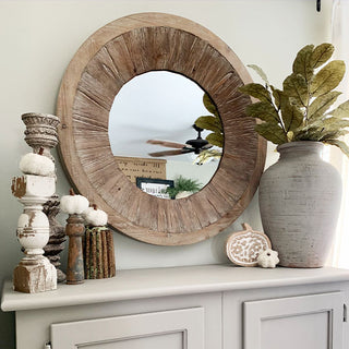 This HUGE Vintage Inspired Distressed Wood Round Mirror is SO popular right now! So of course we are bringing the hottest trends right to your fingertips! Hang it above your mantle, place it in your entryway, bedroom, dining room OR office. Its beautiful textured vintage inspired wood frame will add eclectic charm to even the dullest space! This piece has so much charm and is the PERFECT size mirror to put in any room!