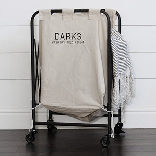 Not only does it roll for convenience but each side of the canvas insert says either "DARKS" or "WHITES" with a removable divider in between! This piece is perfect for any space, small or large! And the canvas laundry tote creates that vintage touch we strive for! This is guaranteed to be a new favorite and your storage staple! Move to wherever your dirties drop... Park it in the mudroom or entryway to catch bags sweaters hats gloves etc. Or use it in the kids' room to make picking up the toys more fun for everybody. We FINALLY found a way to make doing laundry a pleasure!