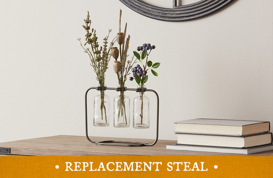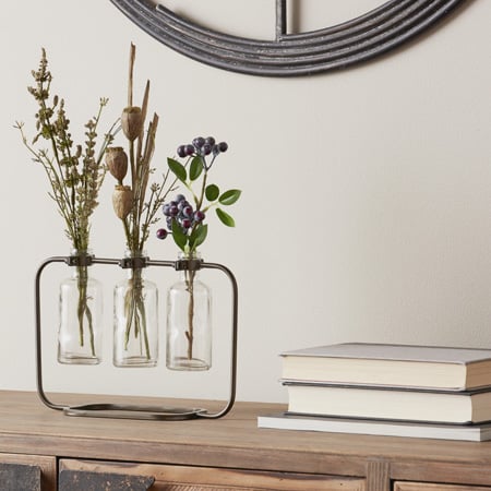 - Beautifully crafted of metal with three glass bottles