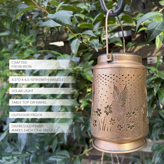 Picture this: super adorable gold iron lanterns with the most amazing cutouts that are basically two decorations in one! During the day they're just sitting there looking all fancy and vintage with these sweet little birds and flowers carved into them.