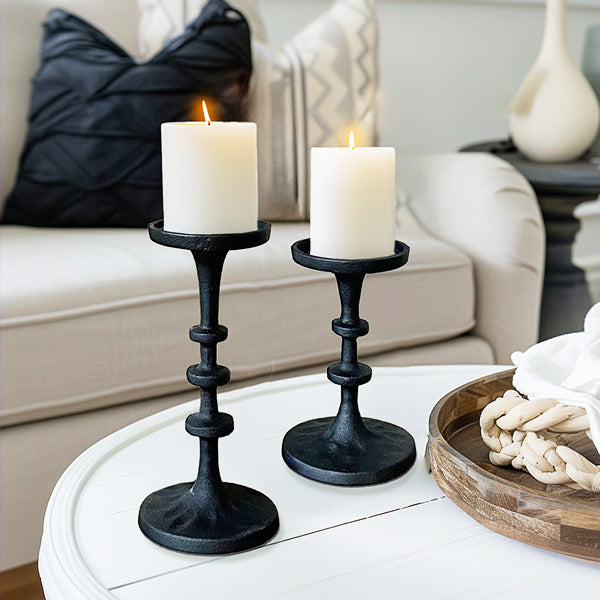 Enhance your home decor with the timeless elegance of our Black Cast Iron Pillar Candle Holders. This set of two candle holders combines classic design with robust construction, making them a perfect addition to any room. Ideal for creating a warm, inviting atmosphere, these candle holders are both stylish and functional.