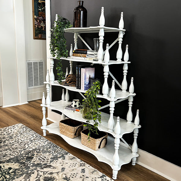 Our Antique-Inspired French Cottage Étagère is a show-stopping statement piece that feels like it was plucked from a grand chateau or antique museum. With its tapered silhouette, turned spindle accents, and scalloped edging on every shelf, this 5-tier beauty delivers architectural elegance and heirloom charm in one breathtaking display.