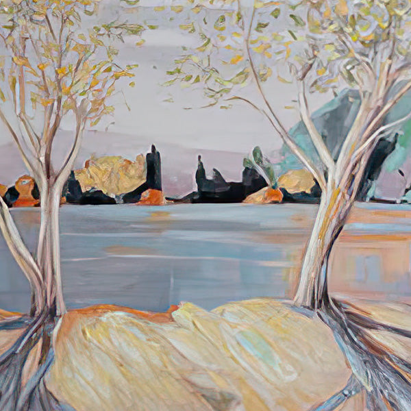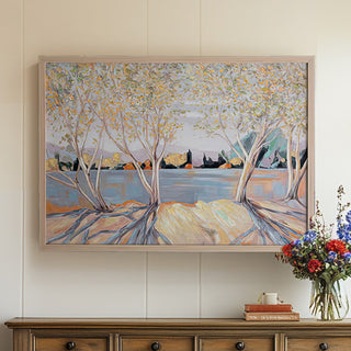 Create a serene retreat in your home with the Trees on the Lakeside Wood Framed Painting. This framed acrylic artwork radiates tranquility, showcasing a peaceful lakeside view with majestic trees mirrored in still waters. The soft, neutral palette soothes the senses, while gentle shadows in the foreground and a delicate pop of color on the horizon enhance its calming effect.