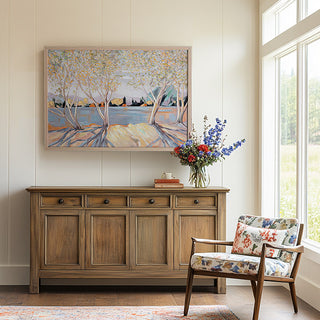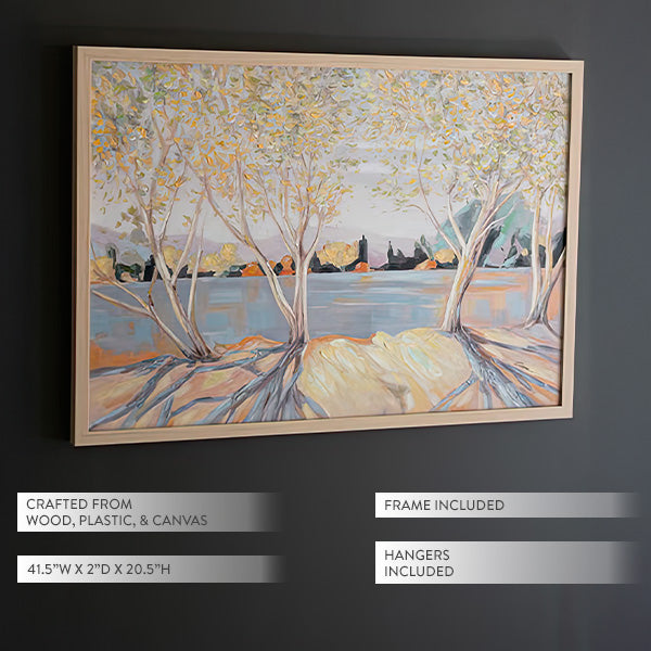 Enjoy the restful charm of this Trees on the Lakeside Wood Framed Painting as it brightens your home with its serene beauty and captivating detail. Perfect for creating a focal point in any room!