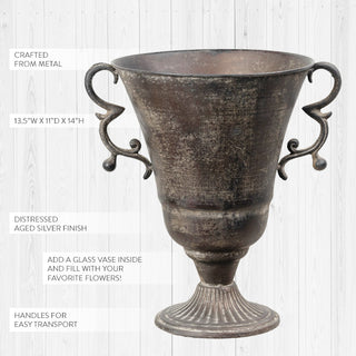 This vintage-inspired Distressed Metal Pedestal Urn Vase is designed to resemble a vintage trophy from the past and will be the PERFECT statement piece making its presense known on your kitchen island, mantel shelf, entryway table or even a centerpiece for your kitchen table! Simply add a bundle of fresh flowers inside and you will have a breath taking arrangement! DON'T miss out on this super good deal! We don't have many of these in stock so grab yours now!